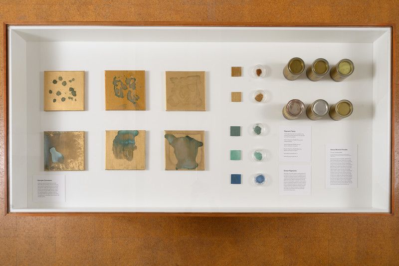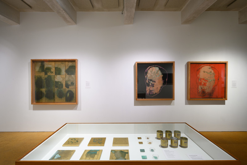 To create the Oxidation works, Warhol and his assistants mixed dry metallic powder in water before adding acrylic medium as the binder.