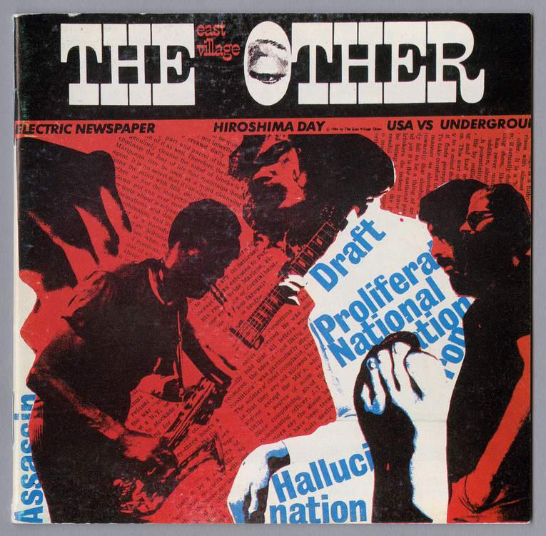 Warhol never created a portrait of Lyndon Johnson, unless you count an obscure Polaroid depicting a framed photograph of Johnson behind a white plaster monkey. But Johnson’s presence is heavily implied in some of Warhol’s portraits of Jackie Kennedy, in which Warhol appropriated an infamous photograph of the stunned soon-to-be-former First Lady standing next to Johnson on Air Force One as he is sworn in as the country’s thirty-sixth president. A few years later, Warhol participated in the recording of Electric Newspaper, Hiroshima Day, USA vs. Underground, a 1966 album created by an underground newspaper called The East Village Other. Other contributors included Superstars and friends of the Factory such as Gerard Malanga, Ingrid Superstar, The Velvet Underground, Allen Ginsberg, Peter Orlovsky, and Ed Sanders.4 The album is a radical auditory collage in which songs, poems, chants, and gossip overlap with excerpts from radio coverage of the wedding of Luci Johnson, President Johnson’s youngest daughter. Warhol himself contributed eleven seconds of silence.