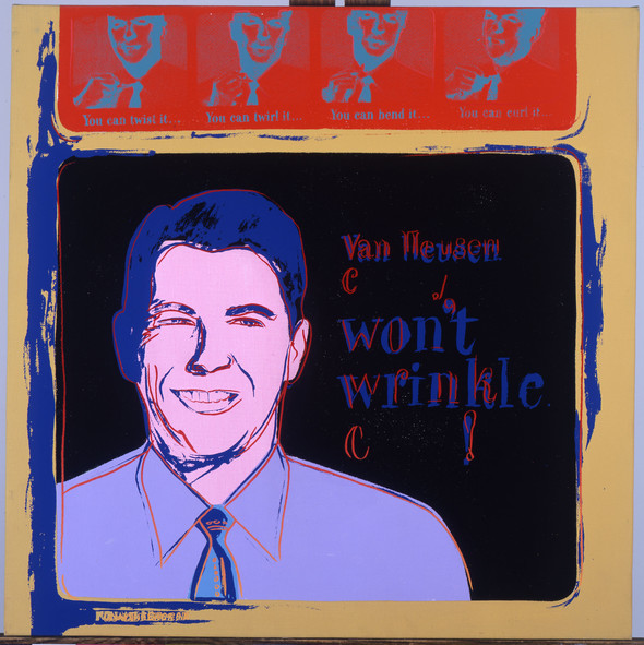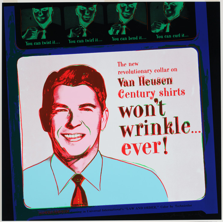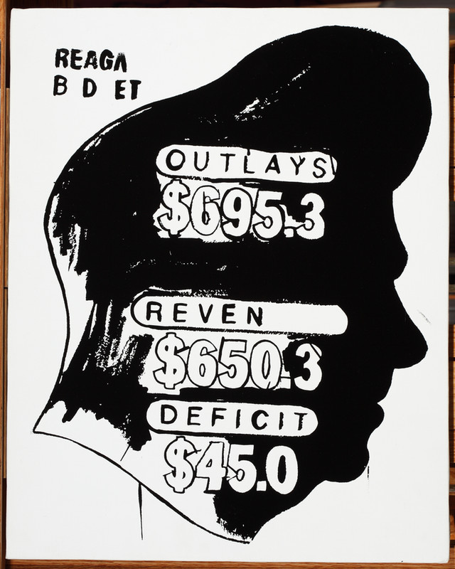 By Reagan’s second term, both Doria Reagan and Bob Colacello had stopped working for Warhol; and with them, Warhol lost many of his connections to the Republican Party. He eventually included images of Reagan in two different art projects, both of which seem to depict the president through a critical lens. Warhol’s Ads series from 1985 features iconic advertisements and corporate logos for brands such as Volkswagen, Chanel, and Apple, as well as celebrity endorsements, like Judy Garland for Blackglama. With Ads: Van Heusen (Ronald Reagan), Warhol pokes fun at Reagan’s Hollywood past, and perhaps even makes the point that Reagan has always been a shill for big business. Reagan Budget (1985–1986), Warhol’s last presidential painting, comes from a rarely exhibited series of small black-and-white paintings of newspaper advertisements and illustrations. In Reagan Budget, the damning numbers of Reagan’s inherently flawed economic plans fill his silhouetted profile. As he had often done in the 1960s, Warhol once again used depictions of the president in the media as his source material; but in these final examples the effect is less neutralizing, as the images show the ways Reagan made money for himself and lost money for the country.