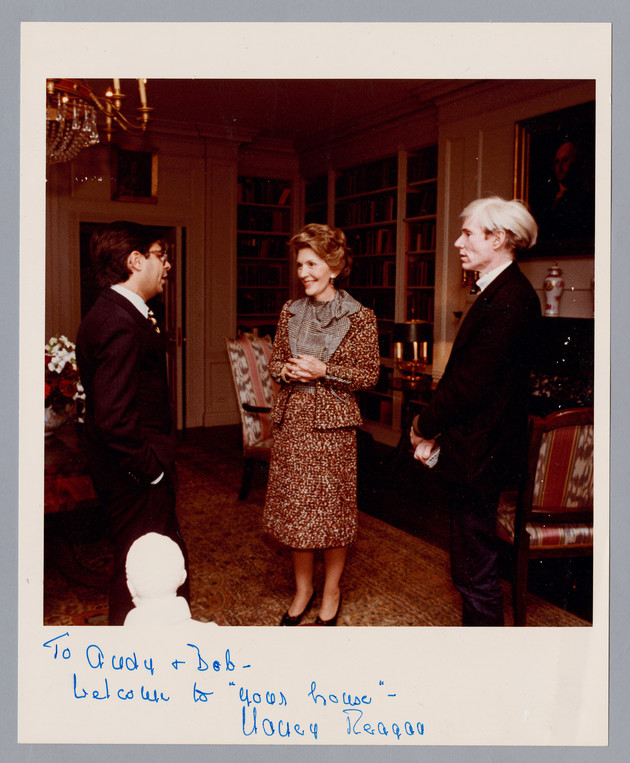 Warhol’s relationship with the Reagans was particularly complex. In 1980, Warhol would have certainly preferred either Ted Kennedy or Jimmy Carter as president over Ronald Reagan. According to Warhol’s assistant Bob Colacello, he turned down two commissions to paint portraits of Reagan in the months leading up to the election.15 However, after Reagan’s electoral victory, Warhol quickly started to warm up to the Reagans. A feature story about Ronald Reagan’s children, Patty Davis and Ron Jr, appeared in the November 1980 issue of Interview, and Warhol attended Reagan’s inauguration in January of 1981.16 Warhol befriended Ron Jr and his wife Doria, attending ballet performances and dinner parties together on a frequent basis in the early days of the Reagan administration. By March of 1981, Colacello had hired Doria Reagan to be his secretary, so there was a Reagan actually working in Warhol’s Factory for a couple of years.17 All of these connections led to Warhol and Colacello returning to the White House to interview Nancy Reagan, who graced the cover of Interview’s December 1981 issue.